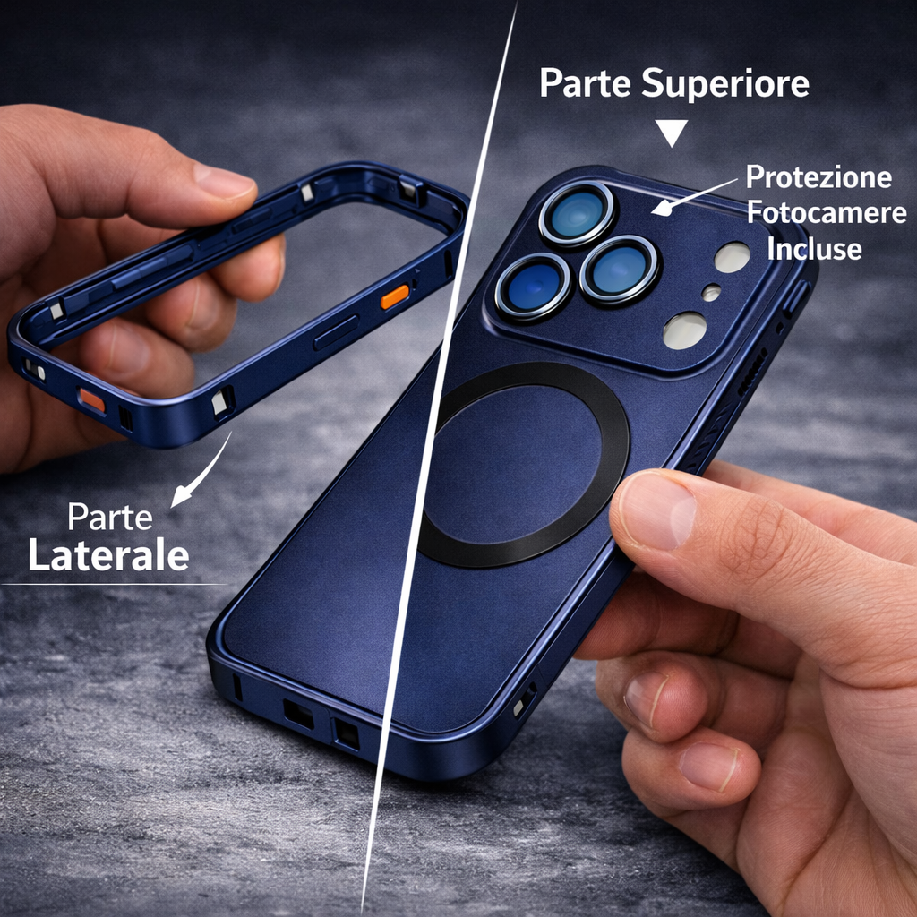 | Protezione Totale 360° | Scocca integrale che difende tutti i bordi, la parte posteriore e ha bordi rialzati per lenti/schermo. |